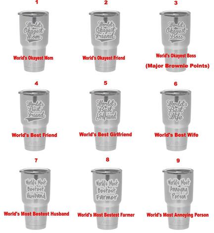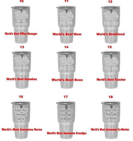 30 OZ YETI KNOCKOFF OZARK TRAIL TUMBLER or RTIC TUMBLER PERSONALIZED ETCHED 2 SIDES $19.00plus sales tax in Ohio. Paypal or Creditcard EMAIL ME WITH PERSONALIZED REQUEST. i WILL SEND YOU SAMPLE BEFORE ETCHING steve@bucyrusblitz.com